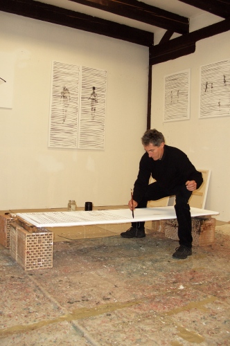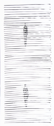 "Entstehen, übereinander"I, 2006,Tusche auf Leinwand, 160 x 70 cm
