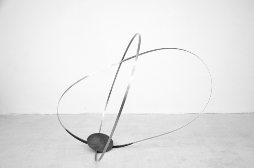 "Kreis und Schleife, kippend", 2021, Stahl, Federstahl, 140 x 140 x 132 cm